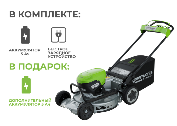 Greenworks 82V 82V LM221S с алюминиевой декой, самоходная, бесщеточная, 2хАКБ 5 Ач и быстрым ЗУ 8А на 2 слота (арт.2519407UG2). Мощная профессиональная самоходная газонокосилка платформы Greenworks Commercial 82V, серии OPTIMUSTM;